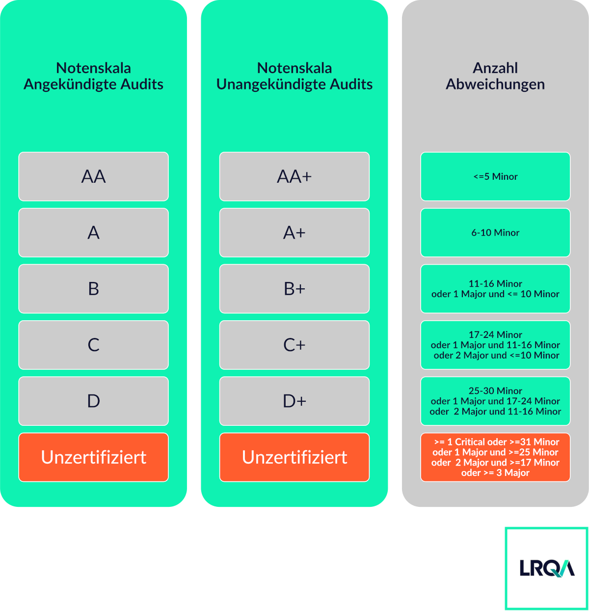 Die Notenskala beinhaltet verschiedene Stufen, die von höchster Konformität (AA bzw. AA+ bei unangekündigten Audits) bis hin zu Uncertified (nicht zertifiziert) reichen. Das nachfolgende Schaubild verdeutlicht die Abstufungen: