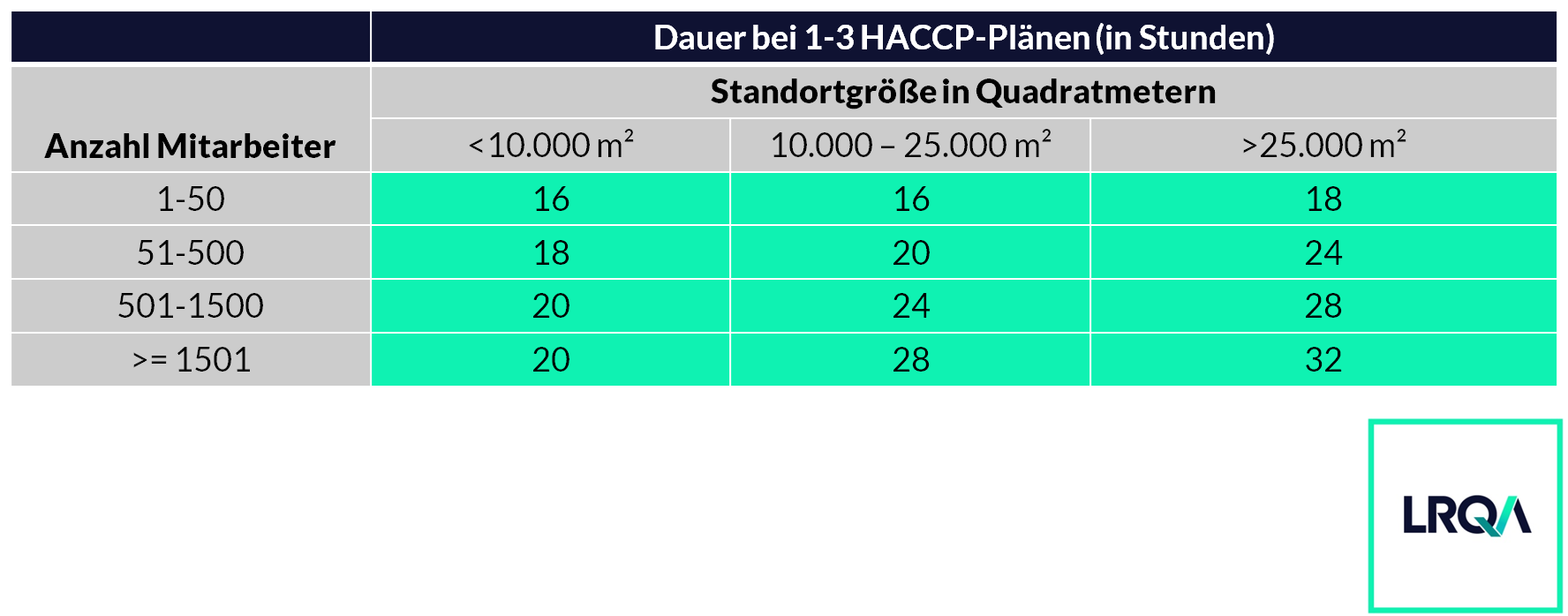 BRCGS stellt weitere Informationen in Form eines Auditzeit-Kalkulators zur Verfügung. Dieser berücksichtigt die drei zuvor genannten Kernfaktoren, die Einfluss auf die Dauer haben. Folgende Auditdauern werden in Abhängigkeit von Mitarbeiteranzahl, Standortgröße und Anzahl der HACCP-Pläne angegeben: