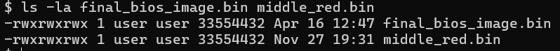 To only update what was in the BIOS region, we can copy the update file from 0x1000000 (16777216) onwards into the flash file at the same location. DD can be used for this by taking the first half of the flash, the second half of the update, and merging them together.