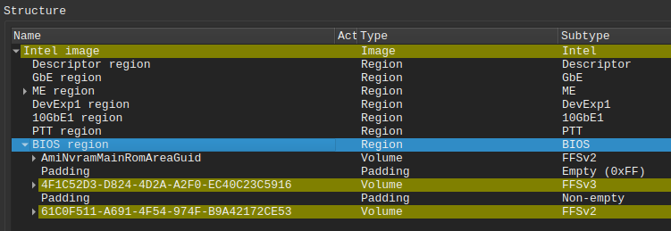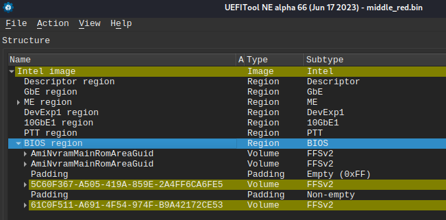 Just to be safe, we can check with UEFITool to make sure nothing went majorly wrong. The screenshot below shows everything looks fine, and the UUIDs for the new volumes in the BIOS region have been updated.