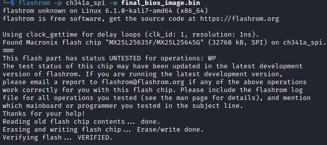 The below screenshot shows reading the middle flash chip using flashrom and the CH341A. If following along, it's important to make a copy of the firmware below, maybe two, maybe three - keep these safe and store original versions with MD5 hashes.