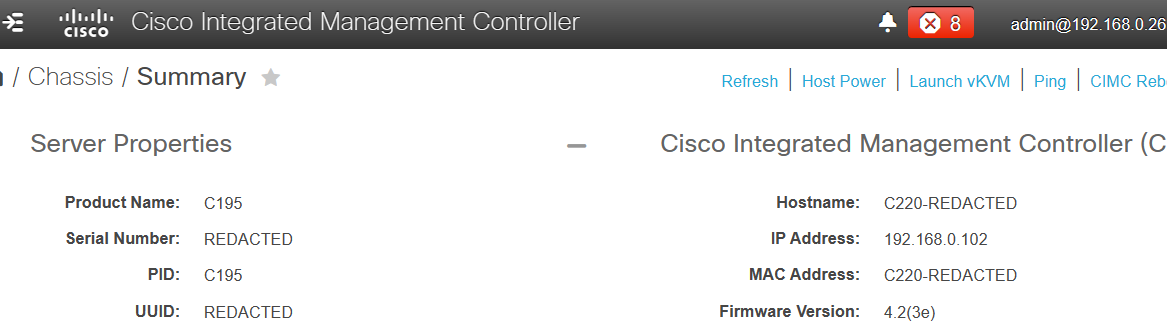 CIMC in itself comes with a default username of “admin” and a default password of “cisco”. CIMC can either be on a dedicated interface or share the onboard NICs. CIMC has full control over the BIOS, peripheral chips, onboard CPU and a number of other systems running on the C195/C220.