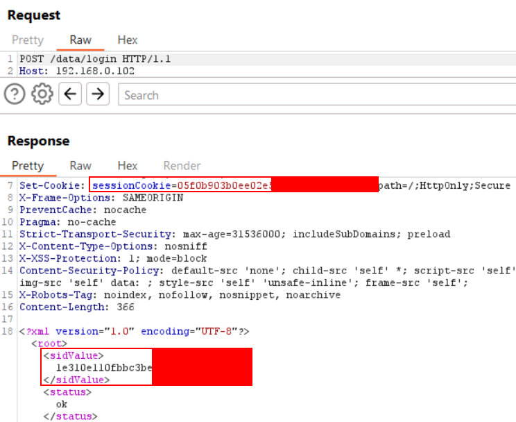 Note: To obtain the sessionCookie and sessionID, the user must login as an administrator using the default credentials of admin and password. The sessionCookie can be taken from the response headers and the sessionID can be taken from the response body under <sidValue>.