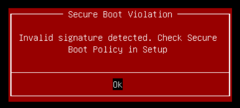 If a USB stick is plugged in, the device throws a Secure Boot Violation warning and reverts back to the EFI shell.