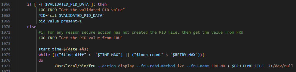 When the script runs, the device gets the current PID value. In our case it was C195, being the model of the device. Note, the below script first attempts to fetch this from /tmp/pid_validated, and if it can’t find this file it will read the PID from the platform management’s FRU. This will display C195, which is then saved in /tmp/pid_validated.