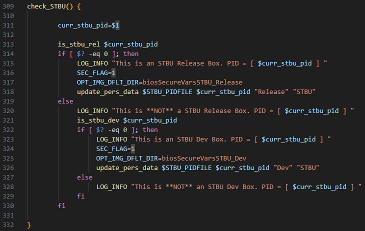The check takes the PID of C195 and passes it to is_stbu_rel, which has a small regex pattern to determine what the device is. If it matches, a number of variables are configured and update_pers_data is called to set the secure boot profile to use. The profile is what the BIOS then uses as a keystore for secure boot.