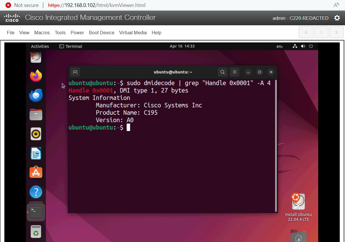 At this point the user is free to update CIMC to the latest version and make configuration changes. It was not possible to disable the secure boot process or run any other code aside from the signed Cisco Appliance operating system. Even though we had the option to configure secure boot keys, these did not take effect nor did any critical configuration changes. CIMC recognised on the dashboard that it was a C195 device.