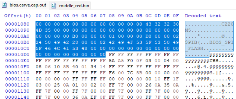 The update BIOS image contains the information that would be placed in the BIOS region. Note, we can’t directly flash the bios.cap file onto the flash chip as there are important sections missing, such as the Intel ME section.