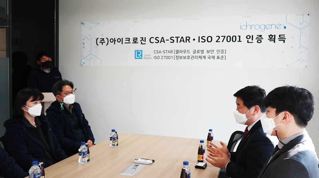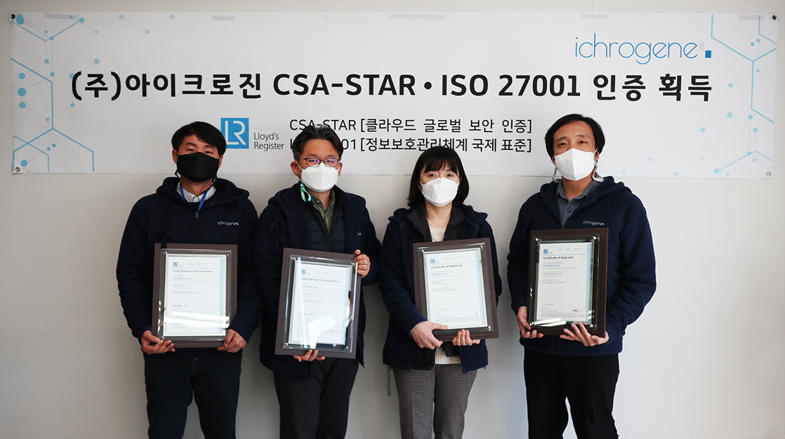 이번 CSA STAR, ISO 27001, ISO 27017, ISO 27018 총 4개의 글로벌 정보보안 표준 인증을 취득함으로써 아이크로진의 정보보안에 대한 의지를 입증할 수 있게 되었는데요. 아이크로진이 유전자 분석 산업을 리딩하는 글로벌 기업으로 도약할 수 있는 계기가 될 수 있도록 인증기관인 로이드인증원(LRQA)도 지속적인 사후 관리를 이어갈 것을 약속했습니다.
