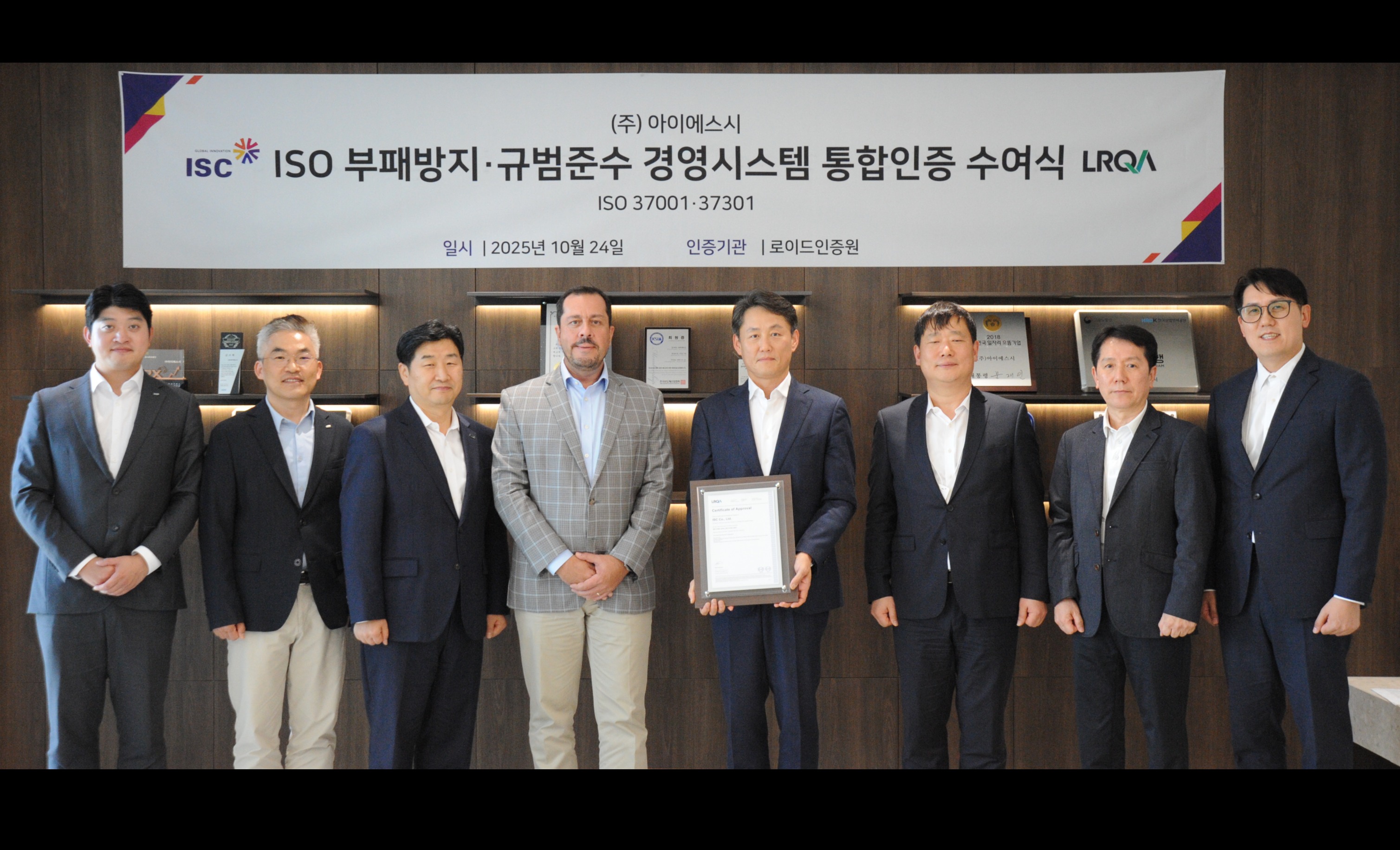 지난 24일, LRQA는 글로벌 반도체 테스트 플랫폼 기업 ISC에 국제 표준 ISO 37001(부패방지 경영시스템)과 ISO 37301(규정준수 경영시스템) 인증서를 공식 전달했습니다.